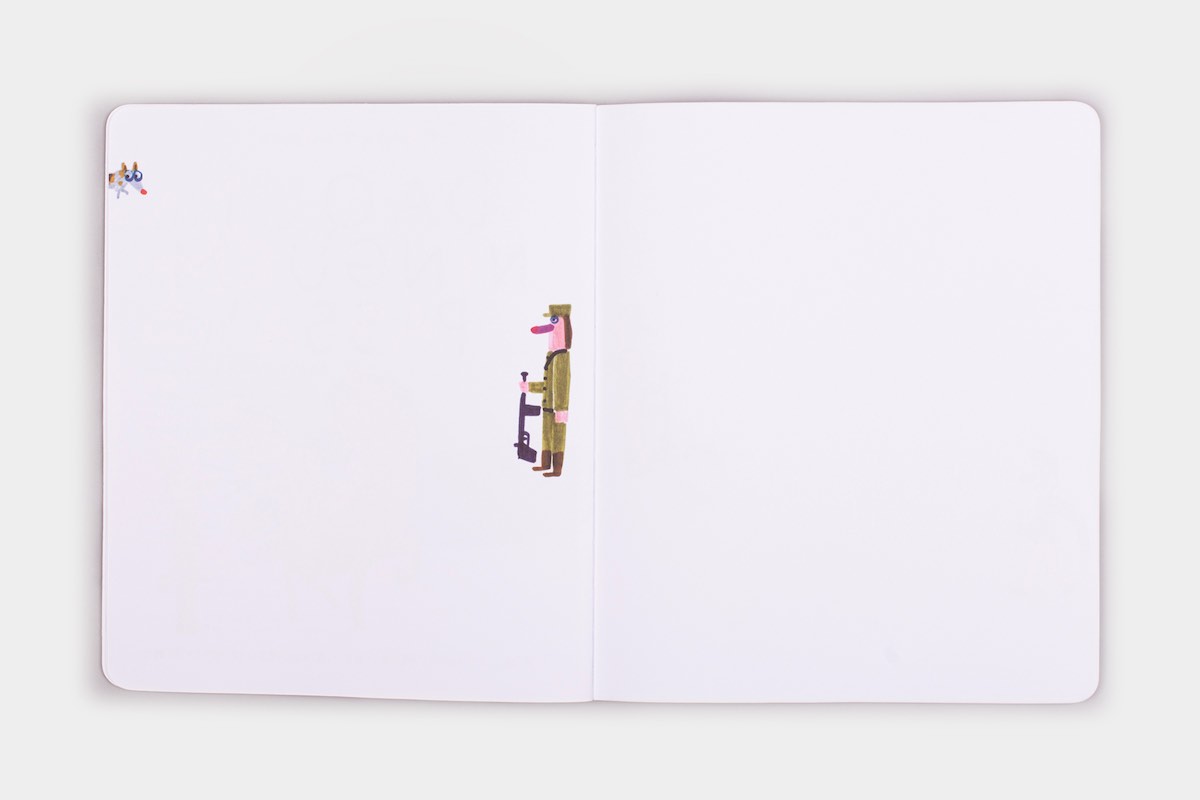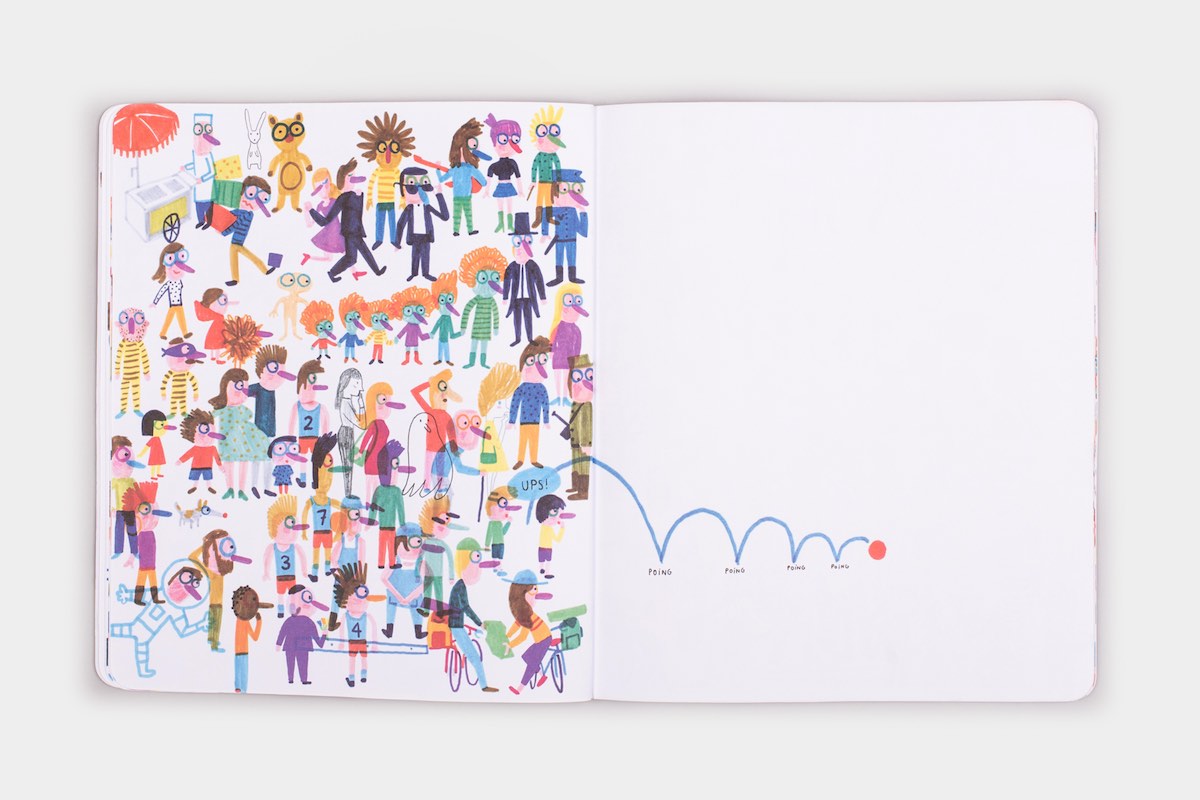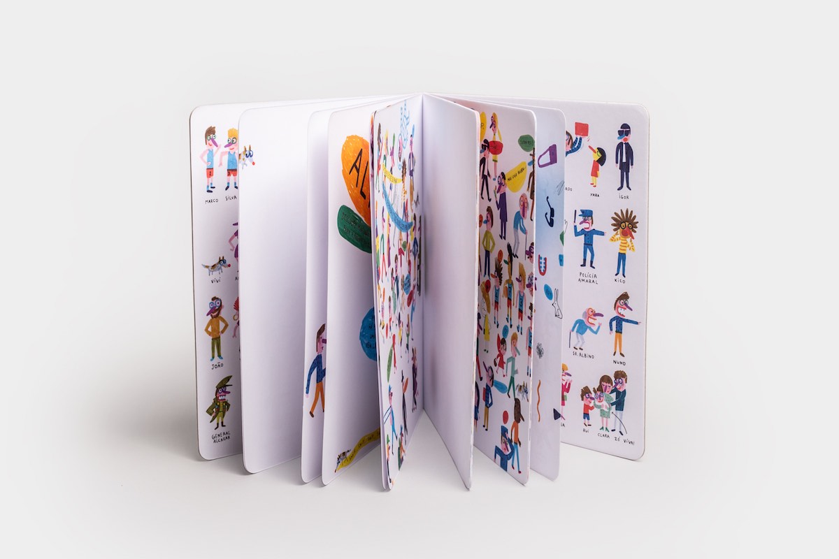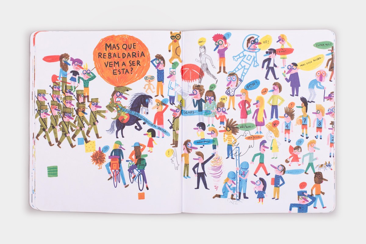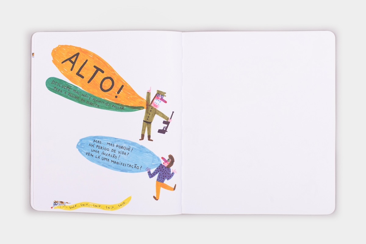 Vibrant and fun characters drawn in felt pen inhabit this story about a general that won't let anyone pass onto the right page. A wonderful story in which the book object (the formal space of the page) participates in the narrative. Part of an "interacive" series by Planeta Tangerina called Cantos Redondos ("Rounded Corners").