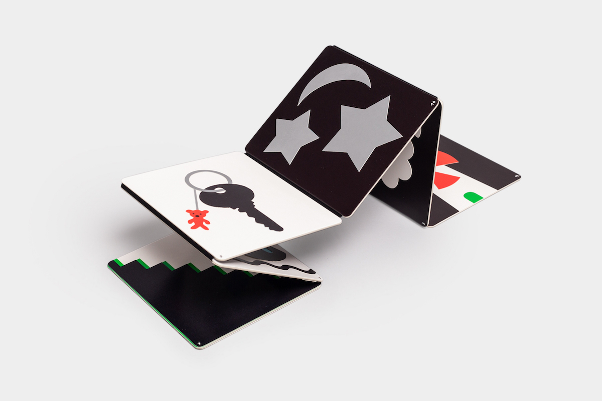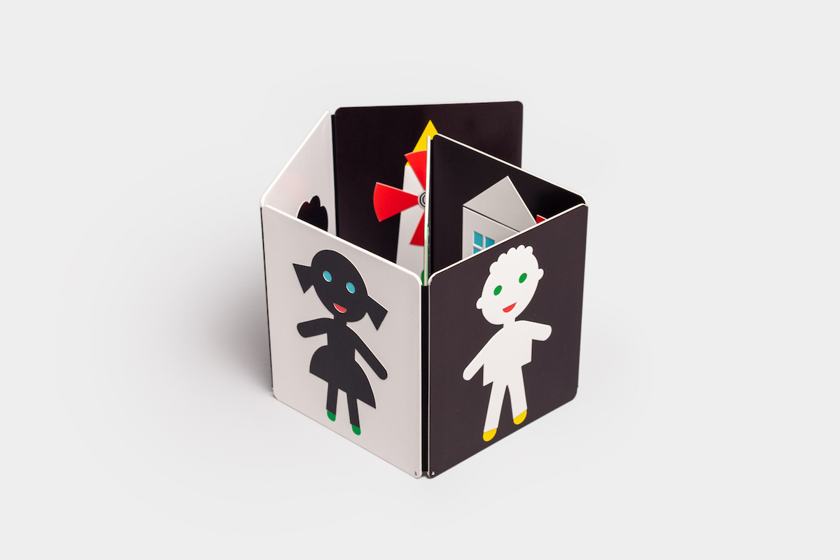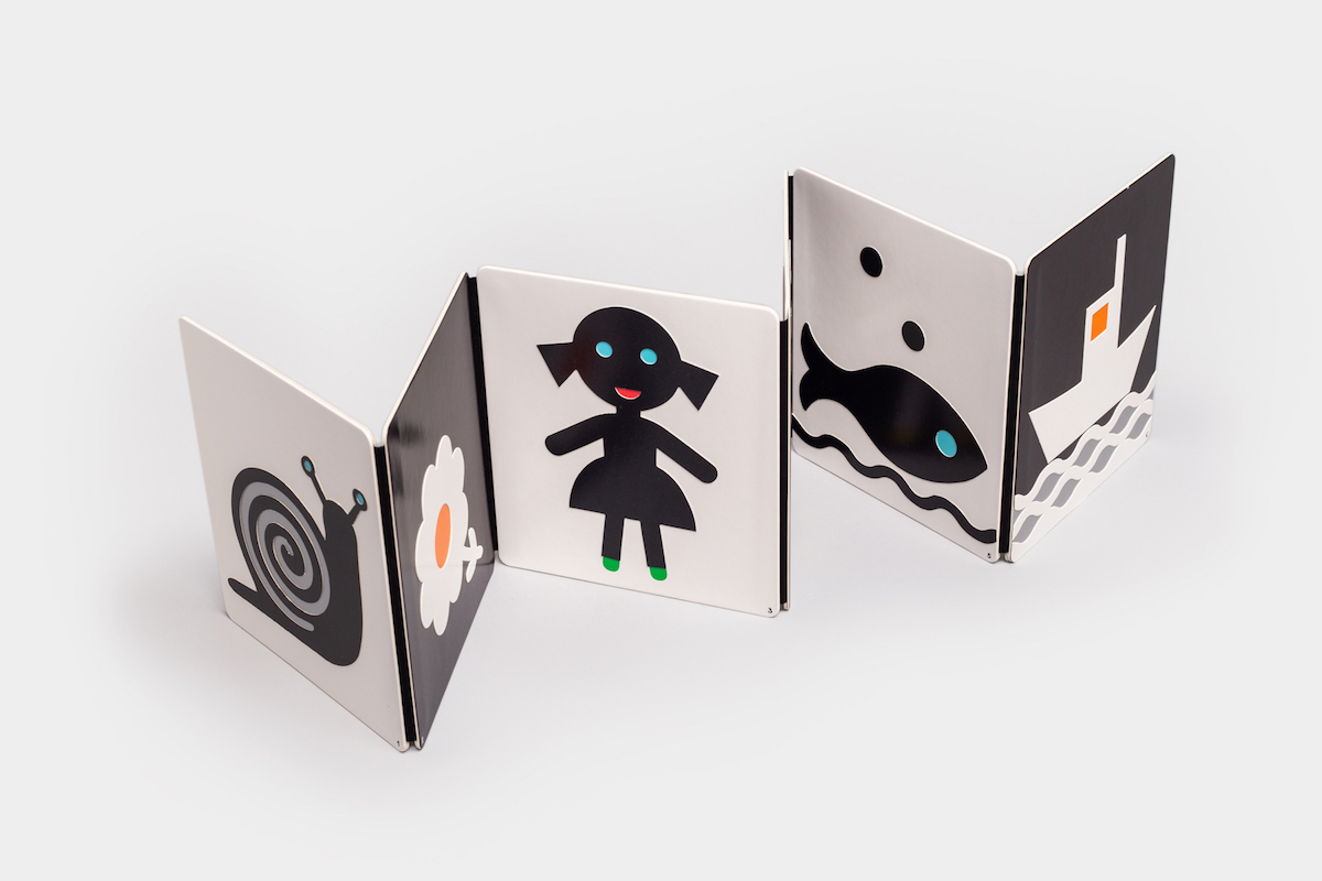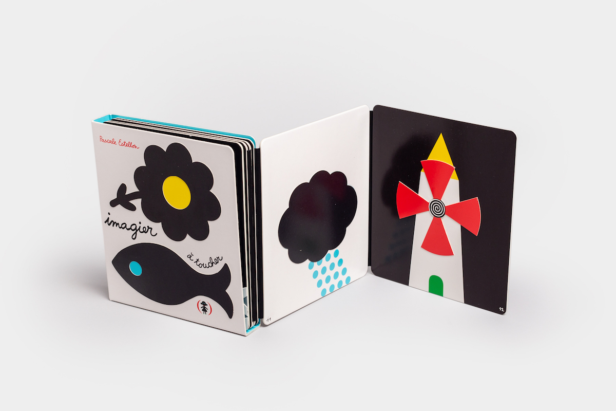 A picture book for young children, mainly in black and white, with some patches of color and silver, here and there. Each drawing is formed on thick laminated paper that offers the possibility to touch the image, to read with your fingers. A fish, a boat, a boy, a girl, a snail, the rain, the stars and the moon, the house and its ladder ... objects, everyday things, and even a windmill in rotation ... A very beautiful object that will make a magnificent first book for children.