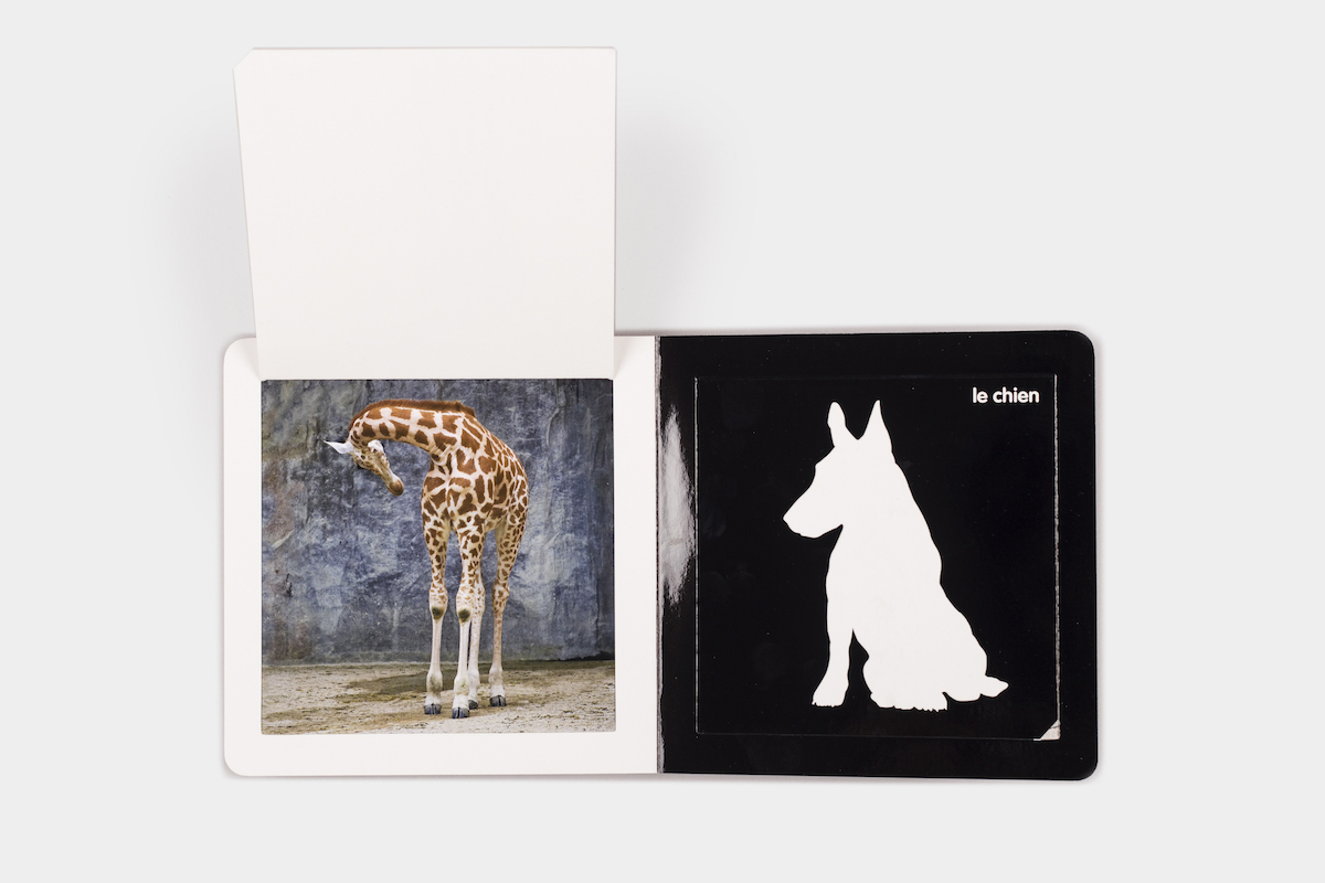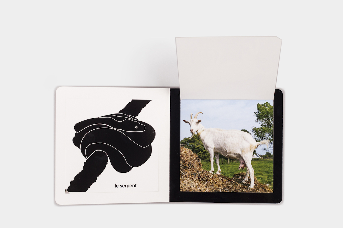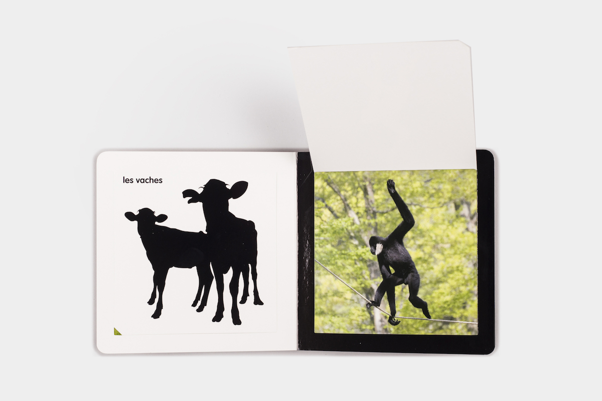 Using the same principle as the Imagier des jouets, we play at guessing what they represent: an elephant? A marabout? A pig or a dog? To find out, simply lift the flap, and underneath you'll discover a color photo of the animal.