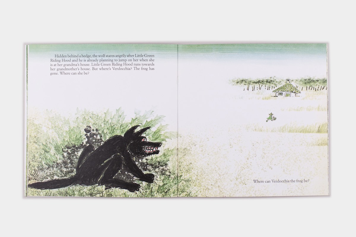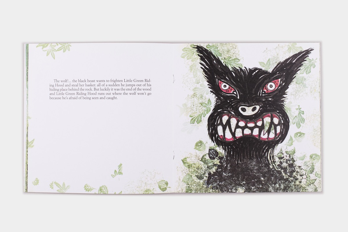 Everybody knows who is Little Red Riding Hood, but perhaps anybody doesn't know the story of Little Green Riding Hood, Little Yellow Riding Hood and Little White Riding Hood, sent by their mother to take their grandmother a basket full of green, yellow, white eatings. The black wolf is waiting for them in the wood, in the traffic jam, in the snow... will it manage to capture them?